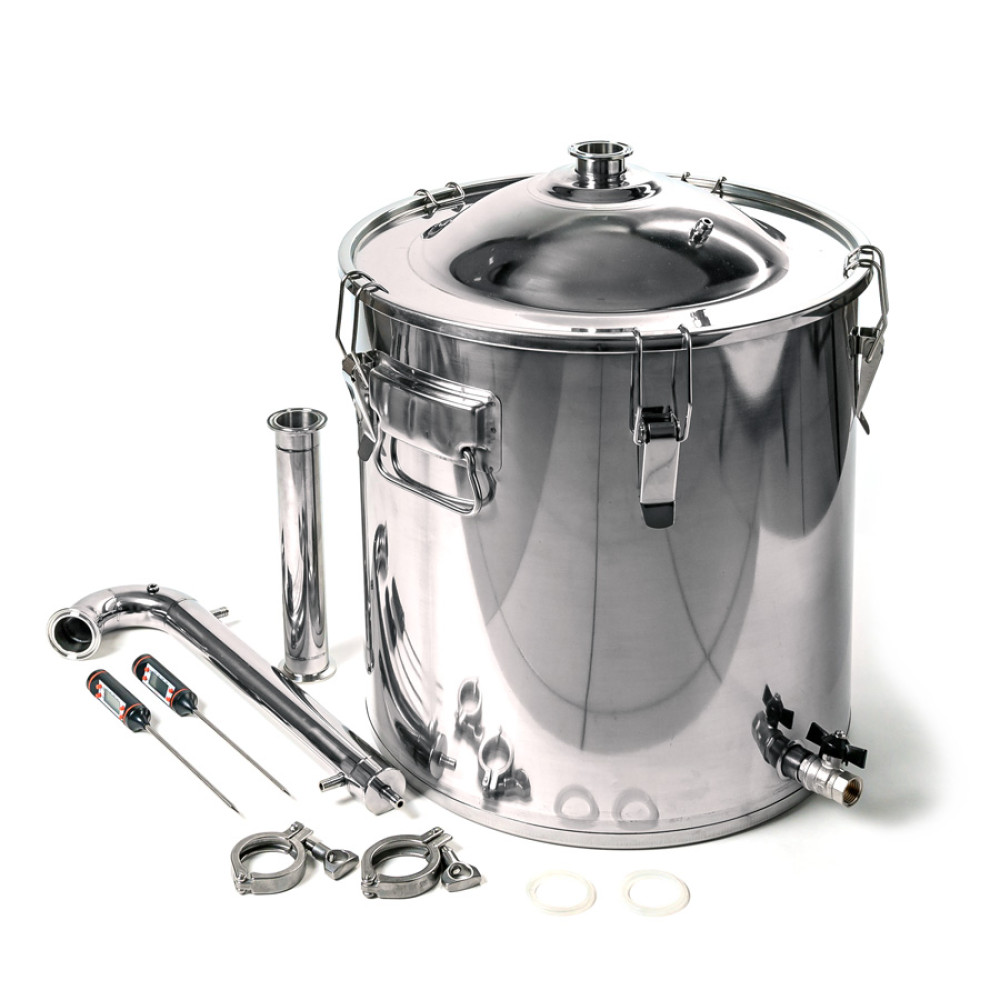 Self-made apparatus "Gorilych" Universal 50/400/t is a good option for the first steps in the new world of distillation and rectification of strong alcohol. The volume of the 50 L still allows to control the equipment alone, the basic configuration makes it easy to get clean distillates from any type of raw material. Usually, the first experiments start with sugar brew, but the wide mouth of a cube with a diameter of 400 mm is adapted to raw materials based on grain or fruits and berries, providing easy access for cleaning. An induction bottom of 5 mm thickness can significantly reduce energy costs when heating a cube on induction-type plates.